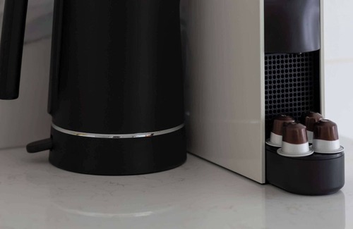 The bright kitchenette is equipped with an oven, a fridge with a freezer, a dishwasher, and a capsule coffee machine, allowing guests to prepare their favorite meals and drinks with ease.
