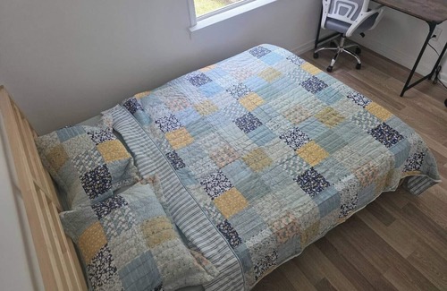 Bright, private room with a queen bed, study desk, chair, and lockable door. Ideal for remote work or quiet rest. Access to shared kitchen, bath, and laundry. Fast Wi-Fi included.