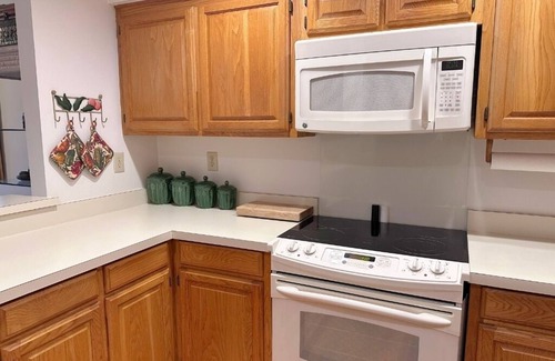 This light, cheery, well-decorated three-level, two bedroom, two bath condo offers views of Young's Mountain with summer peeks and seasonal views of Lake Lure. Steps lead up to a vaulted ceiling great room with sofa, love seat and leather recliner. A glass top table seats 6 with 2 chairs along a breakfast counter. Majestic stone gas fireplace highlights this room with a flat screen HD TV/DVD. The U-shape, oak-floored kitchen features a ceramic top range, refrigerator, dishwasher, microwave, coffee maker, toaster and food pantry. On the entry level is a bedroom with queen bed, wicker love seat and rocker, plus connecting updated bathroom with glass shower door and tub. Steps down lead to the master suite with king bed, sitting area with queen sleeper sofa, flat screen HD/TV/DVD/VCR. Recently updated master bathroom with large walk in shower and private balcony deck. On this lower level is also a laundry room with full size washer, dryer, iron and ironing board.