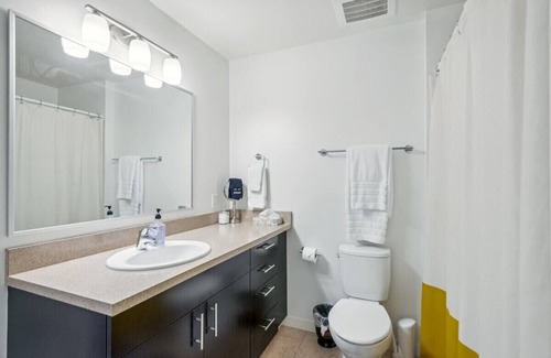 This end-unit studio features a queen bed, fully equipped kitchen, small dining area, bright bathroom with tub/shower combo, and in-unit laundry. Thoughtfully designed for efficiency, style, and ease.