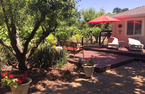 Cozy and comfortable country cottage sits on a half acre nestled next to the remnants of a century old pear orchard providing a Quiet And Tranquil setting. Located minutes away to Sonoma Town Plaza, Valley of the Moon scenic drive wineries and local shops and restaurants. Large open Living/Dining room where guests can spend time together watching TV, listening to music or dine on the French Boulanger inspired table. The kitchen is fully equipped by a retired pastry chef/caterer providing you with an opportunity to cook to your hearts delight