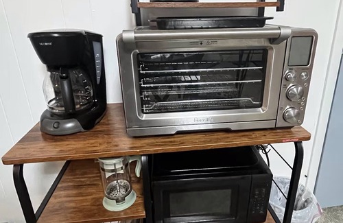 The equipped kitchen with beautiful cabinetry features a variety of appliances such as a coffee machine and capsules for your morning coffee, as well as a Oven Toaster, Microwave.Hot Plate.
