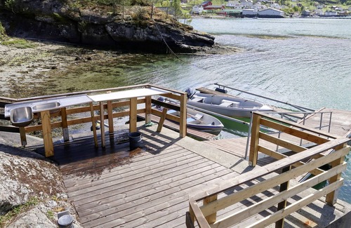 Certified fishing house "Rød Hytte". 800 m from the centre of Herand, 54 km from the centre of Odda, 106 km from the centre of Bergen, on a slope, 50 m from the sea. Bathing jetty bathing place. Private: natural state property 1'000 m2 with trees. Fish-processing table. Available: canoe (extra). Motor boat (on order), Rowing boat. 300 m long bumpy motor access. 50 m footpath to the house. Parking (for 2 cars) at the house at 50 m. Shop 800 m, bus stop "Sævare" 500 m, railway station "Voss" 63 km, ferry "Bergen" 106 km, pebble beach 50 m. Fishing possibilities 50 m. Table for fish gutting available in the annex.