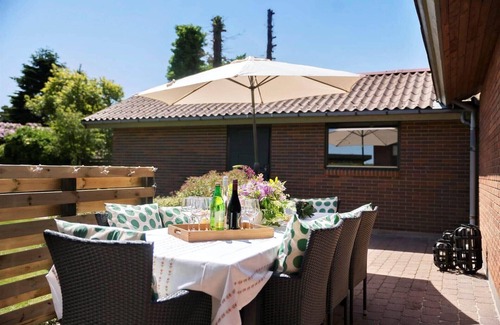 The holiday apartment features a spacious terrace and a beautifully landscaped garden, perfect for relaxation. The enclosed garden offers safety for children and includes a swing for play. Guests can enjoy evenings around the fire pit, creating unforgettable memories. An E-charging station for cars adds convenience for eco-conscious travelers seeking a comfortable retreat.