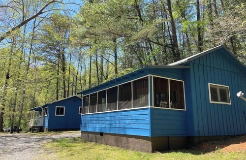This 1930’s historic Fishcamp Cabin is 2 bedroom/ 1 bath and located at Bleu Canoe Campground near Lake Burton. This cabin has two full/double beds, kitchenette, living room and screened porch. Centrally located between Helen, Clayton and Clarkesville, GA. Enjoy the convienece of a restaurant and hiking trails on property. There are three lakes nearby with public access, hiking, wineries, whitewater rafting and more. Check out all our available cabins at our campground, found under my profile!