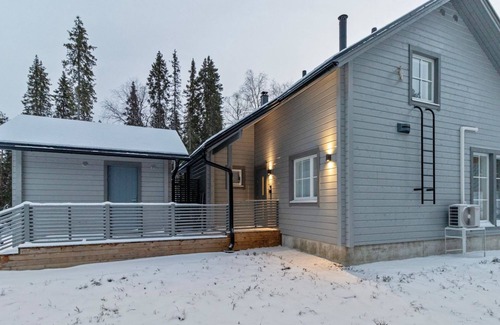 Welcome to the tranquility and exciting adventures amidst the breathtaking scenery of Ylläs! This beautifully crafted half of semi-detached log house, completed in 2021, is located just 5 km from the ski resort but offers complete peace amidst nature.