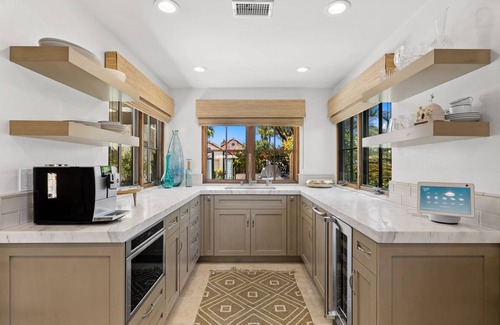 Located half a block from El Paseo Drive, a private gorgeously remodeled condo is a rare find. The inside of the condo features an open concept floor plan, cobblestone floors, vaulted ceilings, and a four person dining table. Enjoy the fireplace on cooler nights along with a 75in. SmartTV. The kitchen is amply stocked for all cooking needs. The condo has been meticulously designed and furnished to deliver a warm relaxing retreat. Sonos & house speakers are located trough out the unit for guest use. For the technology inclined this unit boasts Alexa Echo that controls the entire Smart Home setup, from the front door lock, smoke detectors and thermostat The unit features a private front and back courtyards. Community salt water pool and spa tennis court and pickleball courts are steps away. A work desk featuring a monitor for guest use is also provided. Two car garages are available for guest use with one Tesla charger. A full size washer and dryer are located inside the unit.