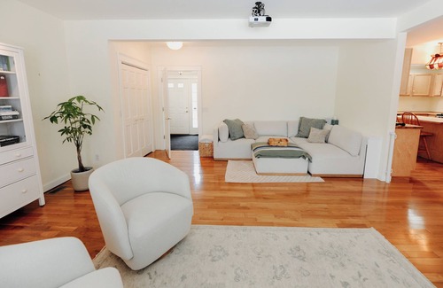 - Living room doubles as a home theater with a large projector screen, Apple TV, and HomePod—perfect for movie nights.