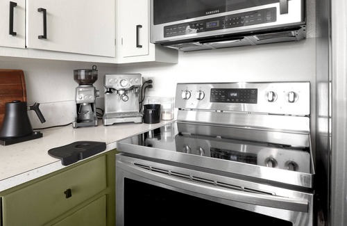Down the deck stairs, the lower level offers a private studio for two additional guests. The convertible bed offers a memory foam mattress, bath with shower and kitchenette. Lower level deck offers spacious dining area with BBQ, umbrellas.