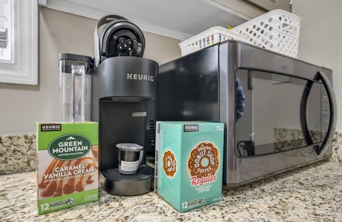 • Keurig coffee maker with complimentary coffee, cream, and sugar