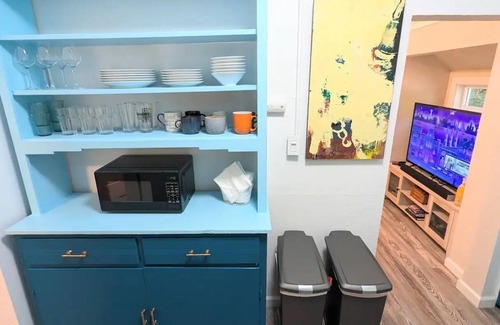 Experience fresh forest air, tranquility and relaxation at our unique treehouse nestled in the redwoods. Private outdoor hangout areas, private entrance, full kitchen, large bedroom with a memory foam king bed, work station with standing desk and high speed internet, laundry and 1.5 baths. A short walk to the Russian River, 1.8 miles to Armstrong Redwoods Park, 25 minute drive to the coast. The cottage is nestled on its own private level of the property while the host's house is on street level.