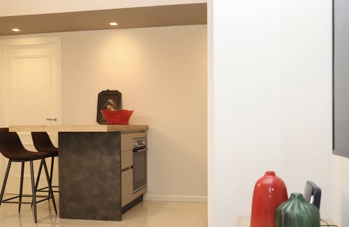 The apartment is on two levels connected by an internal private staircase. The ground floor consists of an independent entrance and a service office, the first floor of a large living room with sofa bed, 55" SMART HD TV, a kitchen area equipped with appliances and new dishes, a bedroom with large wardrobe Poliform and Frette linen.
