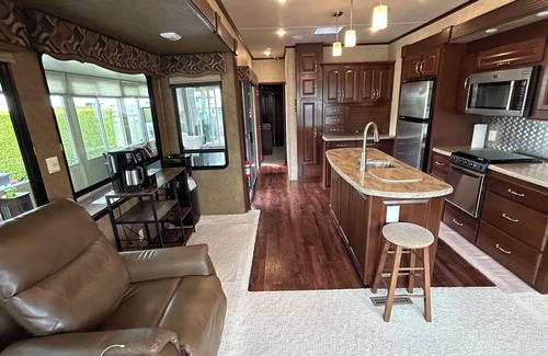 The resort life awaits you! Come enjoy the warmth of the Okanagan Valley and this resort lifestyle. Our destination trailer is spacious with lots of room to spread out in the additional Okanagan room. The yard features a gazebo with fire table to enjoy a romantic evening or enjoy coffee and breakfast on the deck in the sunshine. Comfortable at home feeling with all the amenities including a coffee station and a barbeque to grill the perfect steak. Located in a full amenity resort with three swimming pools and hot tubs, 6 hole pitch and putt golf course, next to walking trails and a variety of rentals to enjoy activities such as kayaking, pedal bikes and golf carts. You deserve to relax and enjoy the resort life during your vacation away!