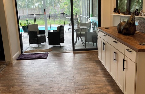 Located in Hobe Sound, enjoy what this 3/2 home with pull out couch. huge Florida room with screened in pool has to offer. With a king bed, queen bed, full bed, and bed, guests will find comfort and space to unwind. This beautiful property boasts modern amenities like a washing machine, WiFi, heating, and AC. Immerse yourself in the tranquil surroundings and make unforgettable memories during your stay. Experience what Hobe Sound has to offer with a stay at our home. This home is backed by Jonathan Dickinson State park so there are tropical birds and wildlife that frequent the property every day and go to Bridge street go East and the beach is pristine! No rocks and they allow dogs without a leash. There’s a huge reef at 11 o’clock so great fishing surfing!