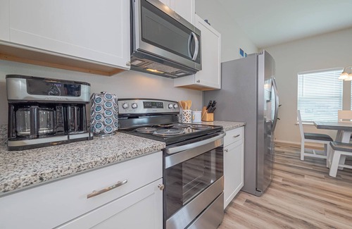 This sunny and modern cottage is tastefully decorated with soothing colors and offers a serene retreat after a day of adventure. It features an open floor plan in the living, dining, and kitchen areas, plus:
