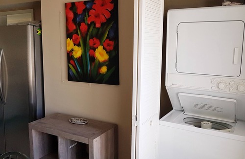 The well appointed kitchen features 4 stainless steel appliances and plenty of counterspace and storage, making it perfect for those who like to cook. With a view of the ocean, it overlooks a full dining space with extendable table to easily seat 6 adults. A full-size washer & dryer is in suite.