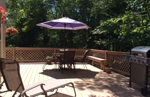 The whole family can fit! There are 2 Full bedrooms on the 2nd floor, a Queen master suite with walk in closet and master bathroom on the 1st floor and a bunk room with sleeping for 6 in the finished basement. There is a full bathroom on the 2nd floor and a half bath off of the kitchen on the 1st floor. The master bath has a huge luxury shower that features a rain shower head and body jets. The main floor has a large living room with a comfy sectional and a 65-inch smart TV over the gas fireplace. The living room opens to the dining space, where there is a dining table for 6. There are also 3 dining stools at the kitchen peninsula. The kitchen has a gas stove, dish washer and all the essential kitchen appliances and tools. Outside there is a very large and very private deck with outdoor seating and a grill. Home also has central air, 2 sky lights, washer/dryer, wireless internet and parking for 3 vehicles.