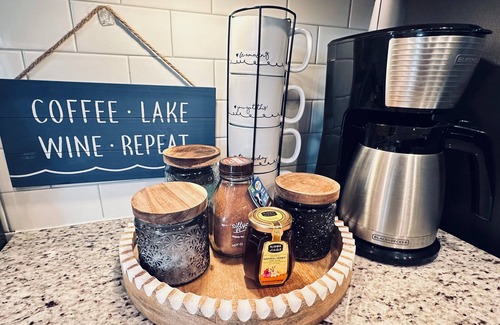 This 3 bedroom, 2 full bath, Craftsman style lake house comfortably sleeps 6 – 8 people and is perfect for up to 3 couples or 2 families with children. Inside, you will find a spacious living room featuring cathedral ceilings, comfy couches, a 70 inch flat screen TV with Netflix, Disney+ and Hulu with live TV channels available, a DVD player, and an electric fireplace. There are several classic board games provided, including games for the littlest family members!