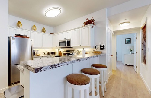 Escape to this tastefully renovated condo in Solitude, UT, where bright and welcoming interiors await you. Perfect for families or small groups, this cozy retreat features a well-equipped kitchen for preparing delicious meals, a comfortable living room with a fireplace to relax in front of, and a layout that includes a king bedroom and a second bedroom with two bunks - a queen lower and a twin upper.