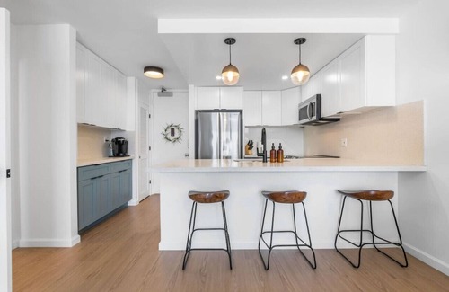 - Brand New Kitchen: Experience culinary bliss in our fully equipped kitchen, boasting an eat-in bar with seating for three. High-end appliances, including a full-sized refrigerator, range, dishwasher, microwave, and drip coffee machine, await to fulfill all your cooking desires. We've provided all the necessities, from bowls to utensils, so you can prepare and serve your favorite meals with ease.