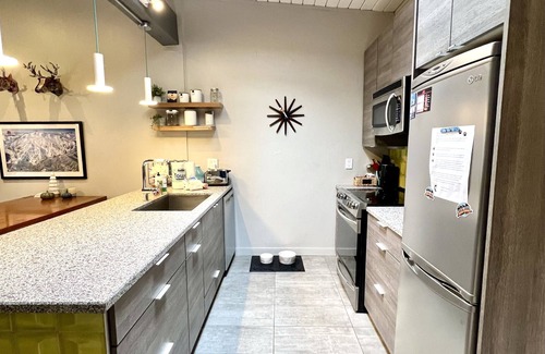 The open living area feels grand with high vaulted ceilings, expansive south facing windows and sky lights, and new hardwood oak flooring throughout. In the living room, there is a comfortable sofa, large flatscreen TV with basic cable and steaming/smart features, central heating and wood burning stove providing the perfect ambiance for all seasons. Off the main living area is a private patio to enjoy the fresh mountain air, with a free supply of firewood. The kitchen has been fully remodeled, with new cabinets, stainless steel appliances, and quartz countertops. The kitchen comes stocked with everything you need to cook a nice meal. There is a dining room table with seating for 6, and breakfast bar seating for 3.