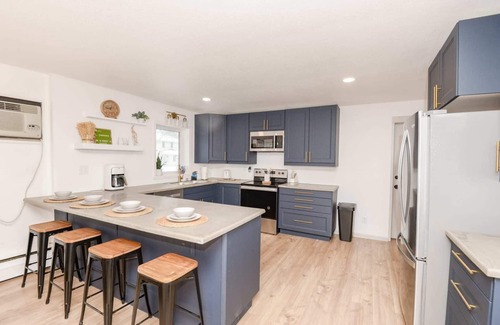 This is the upstairs unit of a house that's been converted into a twinhome with Unit A on the main floor and Unit B on in the basement. Each apartment has its own private entrance. There are two bedrooms, each with a queen bed, both on the main floor of the house (just 5 stairs up into the house). There's a full kitchen with brand new cabinetry, a washer and dryer, two full bathrooms and a living room with a giant smart TV an a working gas fireplace. The open concept Kitchen, dining room, living room is great for hosting friends and family.