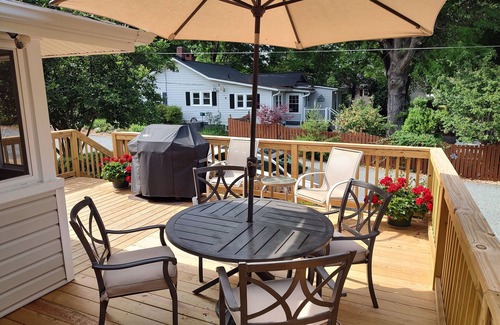 The house has a fully stocked kitchen, dining room, plus one and a half bathrooms. Two bedrooms with queen size beds in each and a roll away provide ample sleeping area. There is a deck and large front porch as well as a fire pit in the back yard for enjoying the outdoors. The sunroom at the back of the house is great for morning coffee or evening relaxing.