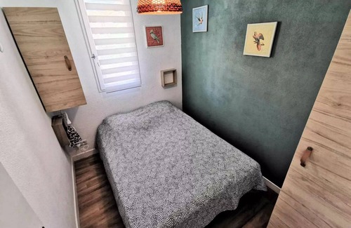 Accommodation: Cozy two-room mezzanine villa for 6 people Close to the beach - A bedroom with a double bed - A mezzanine with trundle beds and a double bed - Equipment: TV, induction hob, mini-oven, microwave, fridge-freezer, washing machine, Nespresso coffee maker, planxa - Surface of 42 m² with a terrace of 20 m² - West exposure - Beach at 50 m and center at 1 km - Supermarket at 500 m - Closed collective car park with barrier, 2 m high - Animals not accepted