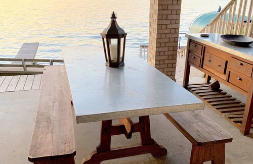 Outdoors, you will find a large sundeck with a large sectional and beautiful views of the lake. Ground level has a custom built 9 foot zinc top table and sideboard. Built-in seating the width of the bulkhead for lakeside fishing or spending hours relaxing with that glass of wine and good conversation. A large fire pit outside is great for gathering and roasting marshmallows. The house has three wood burning fireplaces and plenty of firewood for those cold nights during fall and winter stays.