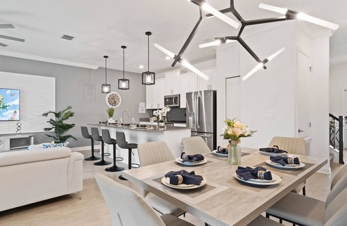This very stylish 4-bedroom, 3-bathrooms, a vacation home can comfortably accommodate 10 guests throughout 1914 square feet of luxurious living space, offering an ideal size and layout for large families and groups traveling together. The moment you first arrive, this home makes a statement! Lush tropical landscaping surrounds the premises, creating a wonderful oasis-like atmosphere. Inside, the house comes with everything you need to feel as relaxed as possible during your stay, from air conditioning and in-unit laundry machines to wireless internet access and a fully equipped kitchen, featuring a breakfast table with all the necessary cooking appliances. Enjoy your culinary masterpieces around the formal dining room table with seating for 8 in elegance. This modern inspired home will make you feel as though you have transported to another land where time disappears and relaxation is king! Choose this home on your next vacation to sunny Central Florida.