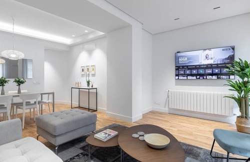 It has a very spacious and open-plan living-dining room, with sofas, armchairs and a flat-screen Smart TV. The dining area has a table with capacity for 6 people in front of the kitchen. The living room has direct access to a small terrace with a table, chairs and views of Calle de Jorge Juan.