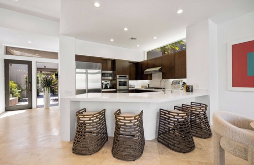Indoors, the open concept floorplan and walls of glass provide seamless indoor-outdoor living. The living room has seating, fireplace, TV and wet bar. The kitchen has an expansive peninsula island, gas range, and 4 seats at the kitchen bar. The dining table has seating for 8.