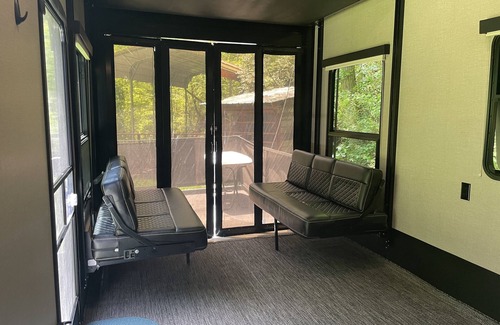 Our RV can accommodate up to 6 guests and is great for families & children. The master bedroom has one queen bed and the second bedroom has a queen over queen bunk set up. The main living area has a 4-seat reclining leather couch.
