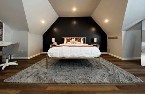 Welcome to our designer high-end space with an open concept living room and kitchen area. The industrial spiral staircase leads to an expansive loft bedroom with a workspace and en suite half bath for your convenience. Stay entertained with smart TVs and high-speed WiFi. The main floor offers a full bath with a large tiled shower, and we provide full-size toiletries and plush linens. Exposed brick and the art deco mantle add character. Natural light creates a warm atmosphere.