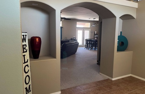 Get ready to relax in this 3-bedroom house in Bullhead City. This gorgeous property features 2 king beds and 1 queen bed, perfect for a tranquil getaway. With amenities like WiFi, AC, and a washing machine, guests can enjoy a comfortable stay. The 3 bathrooms offer a bathtub, shower, and hair dryer for added convenience. Don't miss out on the quaint living room with a cozy futon for extra sleeping space and a large, open, family room for a perfect space to relax, play games, or simply enjoy each others company! Just minutes from the casinos, lake, and river, and nestled into a quiet neighborhood. The exterior of the home includes a pool, RV parking and hook-ups! We look forward to welcoming you to our Ridgeline Oasis.