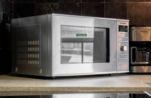 -A modern kitchen fully equipped: refrigerator, freezer, oven, microwave, stove, kettle, toaster, coffee machine, and kitchen utensils.
