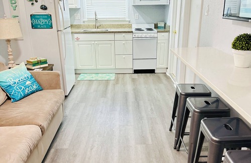 This charming beautifully decorated condo features a full kitchen and breakfast bar, cozy living room with a Roku TV and sleeper sofa, and one bedroom. Step outside and find yourself right next to the beach and boardwalk, where you can soak up the sun and enjoy the calming ocean breeze. With restaurants and entertainment all within walking distance, you'll have everything you need for a memorable and convenient stay. Book the Sea Glass Cottage today and experience the ultimate escape!