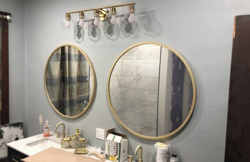 The remodel was completed in April of 2022, so everything is brand new. The two bathrooms were completely remodeled to have high-end appointments of gray and gold marble tile, shower doors, and even a first-floor laundry and double sink included in the lower-level bathroom. The upstairs bathroom also has a lovely vanity with a sitting bench for getting ready with a marble-tile backdrop.