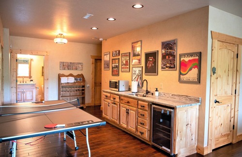 When you walk down to the terrace level you will find a beautiful wet bar, game area with ping pong table, family room, full bathroom, and 2 more bedrooms. One bedroom offers 2 sets of twin bunk beds and the other bedroom offers a queen bed. The deck offers you views of the Coosawattee River and the ability to hear the sounds from the river. Also, on the deck is a six seater hot tub overlooking the river.