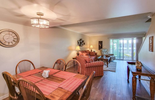The welcoming living room boasts warm wood floors and a cozy area rug. Curl up on the cozy sofa, armchair, or recliner to relax after a long day of fishing, swimming, or exploring. Catch your favorite show on the large TV with cable or just enjoy each other's company while laughing, trading fish stories, and making new lifelong memories. There's plenty of space for all your drinks and snacks on the coffee and end tables.