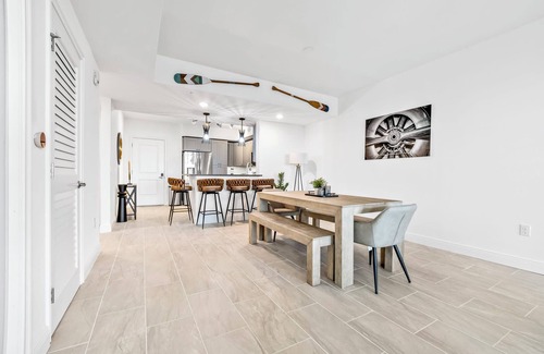 Indulge your culinary tastes in the expansive, fully equipped kitchen complete with brand new top-of-the-line appliances and sleek finishes. Gather around the spacious dining table to enjoy your culinary creations while enjoying the company of loved ones. Afterward, unwind in the inviting living room, equipped with a 65-inch TV and ample seating for everyone to unwind and entertain.