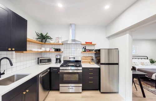 Each apartment unit has its own kitchen, equipped with all new appliances and finishes as well as cooking utensils, pots and pans, general spices, and basically all the tools you need to make morning pancakes, spaghetti bolognese dinner, and everything in between. (Groceries not provided.) For morning coffee, there is a k-Cup machine and coffee pods, but you are welcome to use your own flavors as well. You will find all the dish ware, serve ware, and drink ware you need for such a large group to dine, but don’t worry, we have you covered with a dishwasher too.