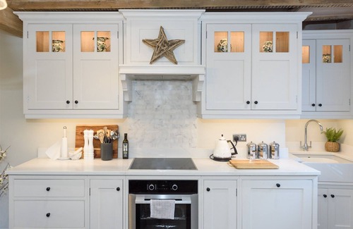 The lounge has exposed beams, woodburning stove, and bi fold door with a superb view. It also features quality furnishings, beautiful fabrics and a large smart tv.