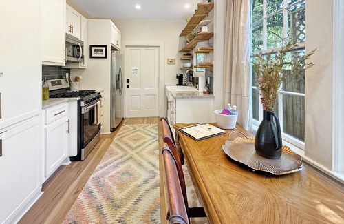 Inside, you'll find a cozy queen bedroom and a full bedroom, along with a beautifully updated bathroom. The fully stocked kitchen has everything you need — whether you're whipping up a quick breakfast before a day of exploring or enjoying a relaxed dinner at home.