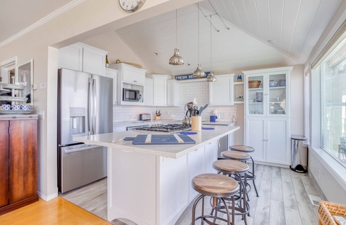 As soon as you cross Haven Found’s embracing courtyard with its colorful inset glass squares and open the front door to this wonderful oceanfront home, you’ll understand its name. You’ll know instantly that you’ve found the perfect haven for your stay on the coast! The sounds of the dashing surf will be music to your ears, and the spectacular, panoramic views of the Pacific will soothe your eyes. Your surroundings are bathed in ocean light from the large windows and skylights and the cool, bright decor of this beautiful home. Contemporary beach decor and luxury furnishings with a gas fireplace and a large flat-screen TV make the living room the heart of the home. Outdoors, a clear wind-screened deck puts you above the ocean and open to views to Lincoln City to the south and Cascade Head to the north. Indoors, the dining room seats six, and four additional seats at the quartz kitchen island will accommodate your whole crew. Even the most particular chef will love the gas range, stainless appliances, and streamlined, cool decor—not to mention the ocean view! The main-level bath has a huge skylight, bringing sunlight into the spacious walk-in shower. The laundry room has counter space and a sink and adjoins a bonus room for the kids. Upstairs, two bedrooms share a full bath; both have fantastic ocean views and their own TVs and sinks. This grey, shingled beauty is three doors down from easy beach access, and your Roads End location is a 5-minute drive to the Chinook Winds Casino, restaurants and shopping. Once you’ve found this perfect haven with its comfortable, luxurious surroundings and ever-present ocean, you’ll be back, again and again, to enjoy all Lincoln City has to offer.
