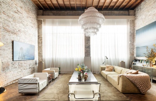 A stay here will leave you captivated by the industrial charm of the newly renovated interior, where exposed brick walls and lofty ceilings seamlessly blend with contemporary design elements. A dramatic spiral staircase is the piece de resistance of this unforgettable home, although a lift is also available to reach the mezzanine living level and further bedrooms. Entertain in style in the open-plan living area, where soaring windows flood the space with natural light, and frame sweeping city vistas. Designer chairs adorn the space, forming an inviting living area around a suspended fireplace, awaiting conversation and relaxation. If it’s practicalities you’re looking for, the sophisticated marble kitchen offers ample space to cook, drink and dine, with a large island doubling as a breakfast bar, and boasting all the modern appliances you will need including a stylish clear fridge and barista-style coffee machine.
