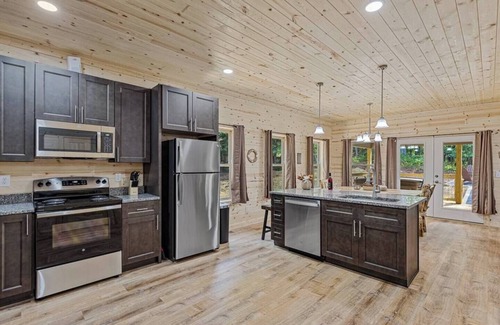 Inside, the cabin boasts an open-concept living area with wooden walls and ceilings, and a lovely stone fireplace that serves as the heart of the home. The gourmet kitchen is well equipped with a full-size washer and dryer, dishwasher, granite countertops, and a spacious island, perfect for entertaining.