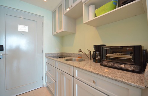 The suite has 2 very comfortable queen sized beds, desk and roller chair, large closets, oversized shower in spacious bathroom. washer/dryer, all linens included, fully equipped kitchenette, dedicated wi-fi, flat screen Smart television and patio seating area for four. The balcony offers spectacular views of the safe, flat, palm lined walking beach, and a main deck social area by the infinity pool. The kitchen comes fully equipped with electric cooktop, microwave, refrigerator, large toaster oven, coffee maker with thermal carafe, and all cooking and serving utensils. Electric BBQ available for rent to use on your patio. Rental is offered by the building administration with advance notice.