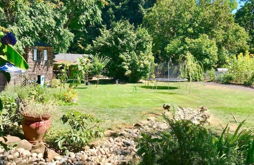 The cottage is set back 150 feet from the main house. It includes a queen bed + futon. Pack 'n play available at your request. Kids can run around the large yard.