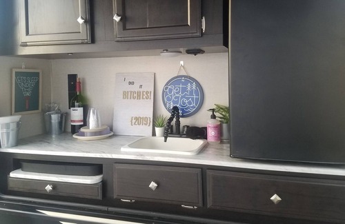 Come enjoy our 2019 Trailer which is 40 feet long with 3 large slide-outs. This is an open-concept layout that gives a roomy vibe. Dark colors and earthy green decor greet you with warmth. Fully stocked with lush amenities and extras make this a lovely choice for your romantic weekend.